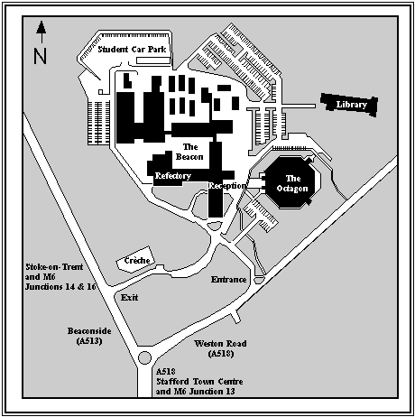 Exit M6 at Junction 14, take the A34(T) to Stafford. Over the large roundabout to the A513 Beaconside Road follow signs to Staffordshire University.